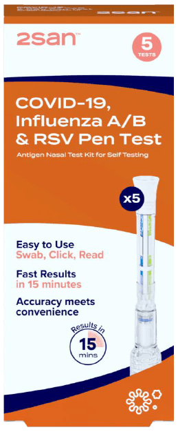 The 2San® COVID-19, Influenza A/B and RSV Pen Test is a simple, mess-free testing device designed to make home testing easier. With a single comfortable nasal swab, the test can detect four viruses - COVID-19, Influenza A, Influenza B and RSV.
